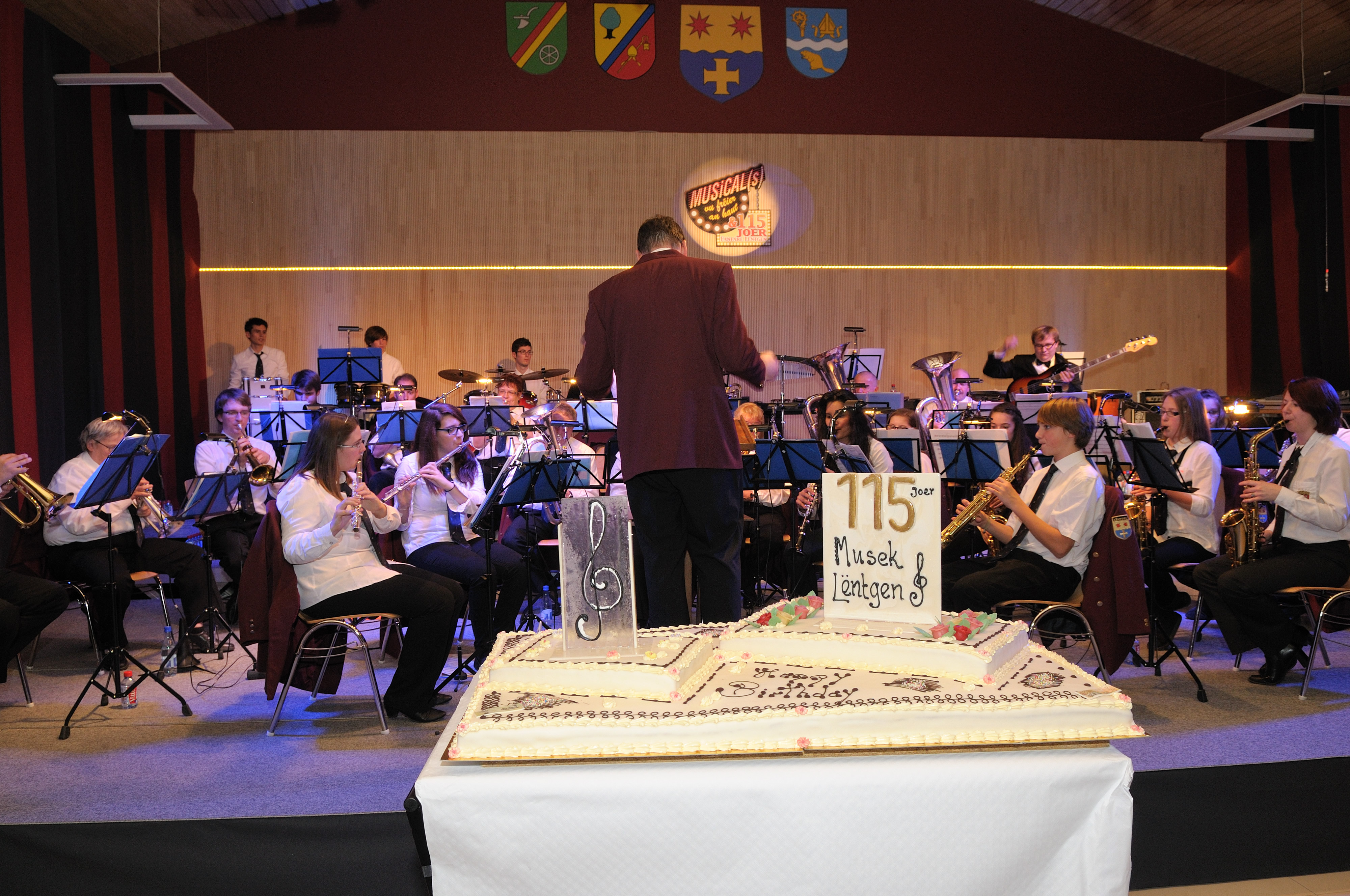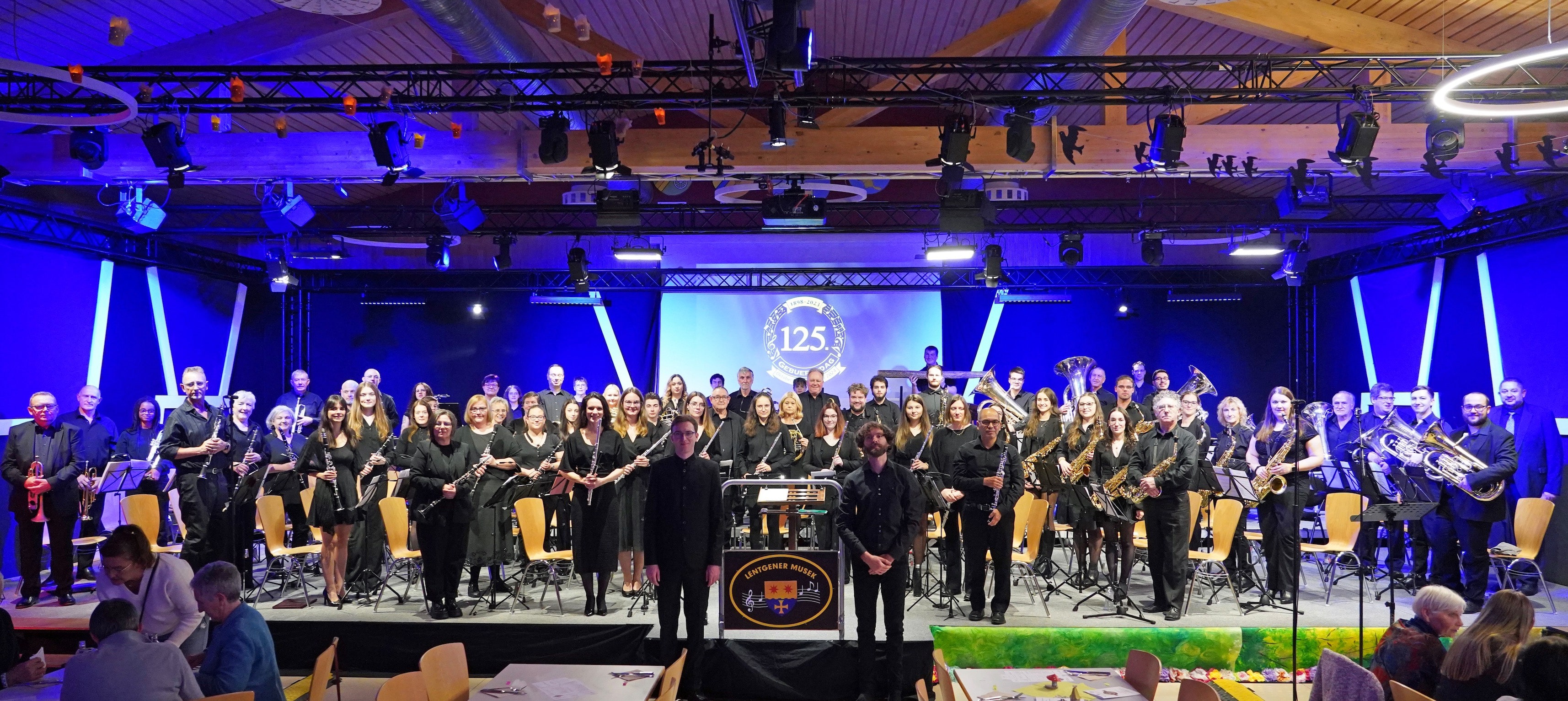 „125 Joer Lëntgener Musek, dat ass e Grond fir ze feieren! Dat sinn 125 Joer Engagement vun den ënnerschiddlechste Persounen a ville Generatiounen déi d’Lëntgener Musek zesumme geformt hunn. Entweder musikalesch mat engem Museksinstrument oder mat Engagement, Iddien, Organisatiounstalent a villem méi.“ (Broschüre 125 Joer Lëntgener Musek) An dat gesi mir nach haut, den Engagement ass opgebrach, vill Léit investéieren an engagéieren sech an der Lëntgener Musek. Dat konnt een net zulescht um Gala-Concert 2023 an 2024 gesinn. Fir béid Gala-Concerten am Kader vun den 125 Joer hunn si sech getraff, Iddien gesammelt a gebastelt sou datt de Sall esou schéi gerëscht war wéi nach ni. Fir den Gala-Concert 2024 hunn mir eis Frënn vun Kuringen invitéiert. No engem Intensiven Dag mat Prouwen hunn mir Owes zesummen den Gala-Concert gespillt. Op der Bühn waren iwwert 70 Musikanten an et war en Onvergiessleche Moment.