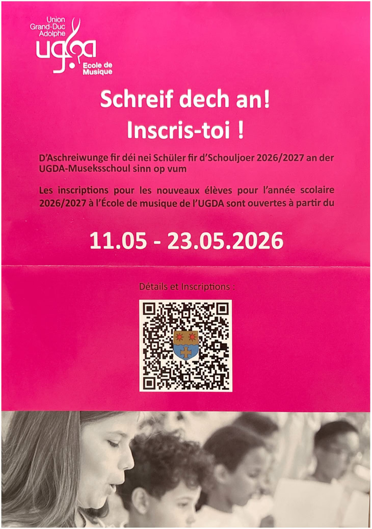 D’Umeldungen fir Coursen sinn ëmmer zwëschent Mee a Juni. Gären kënn dir och op eis Porte Ouverte am Mee kommen wou dir Instrumenter kënnt ausprobéieren an all är Froe stellen.