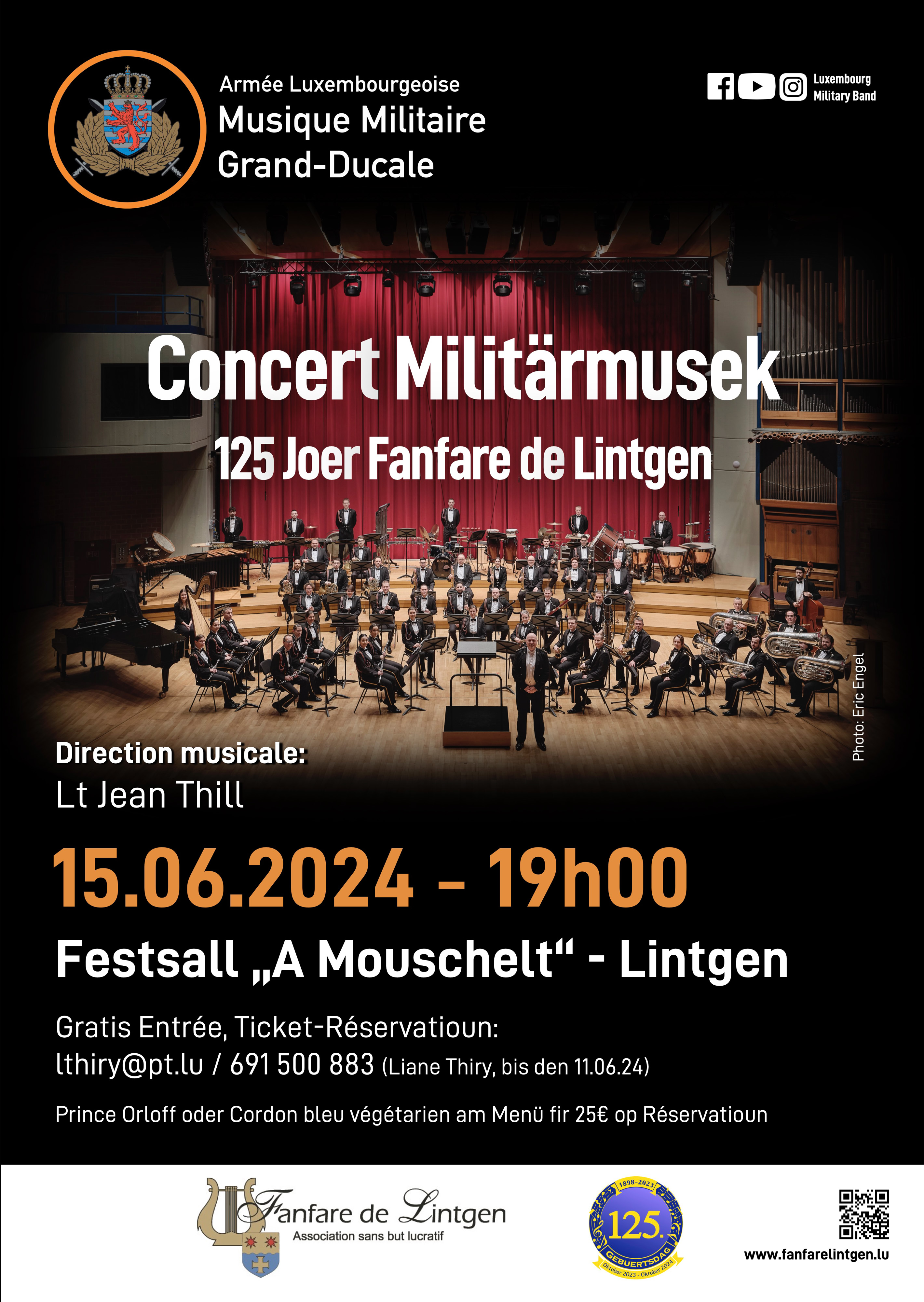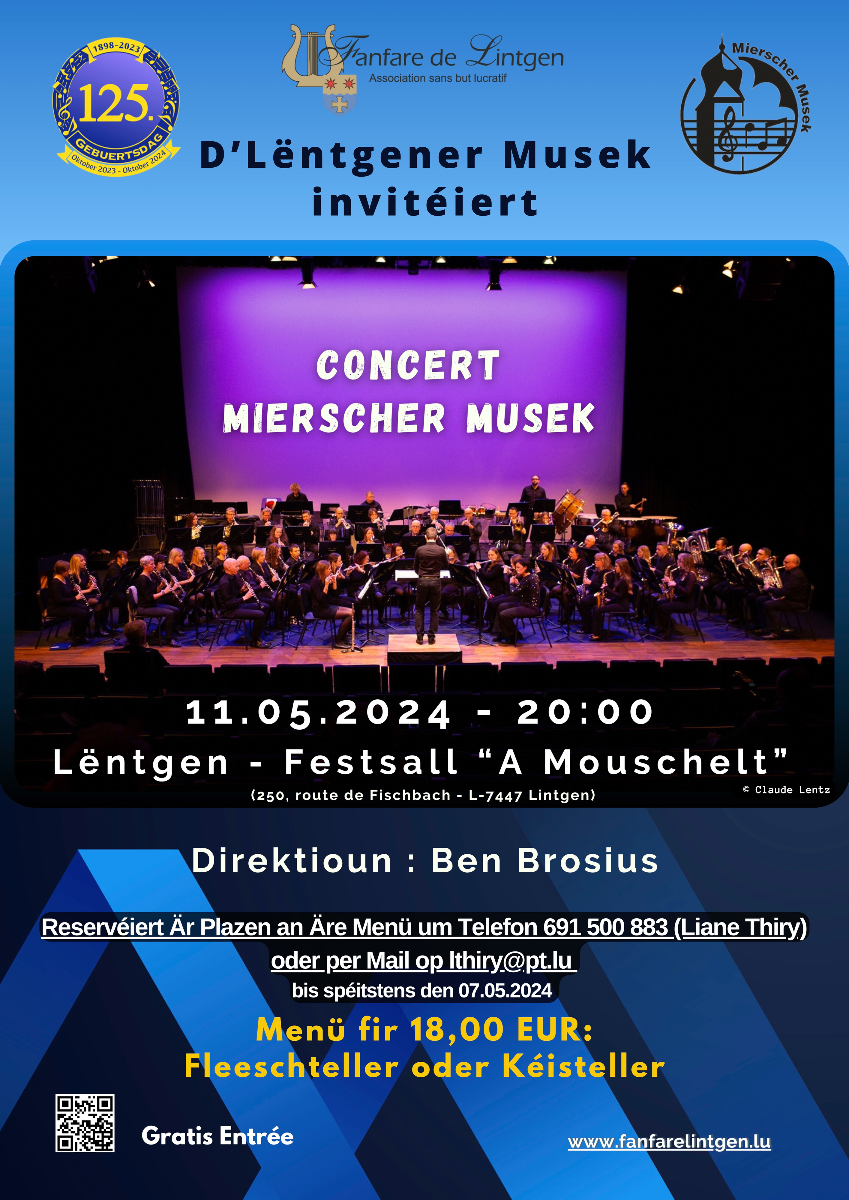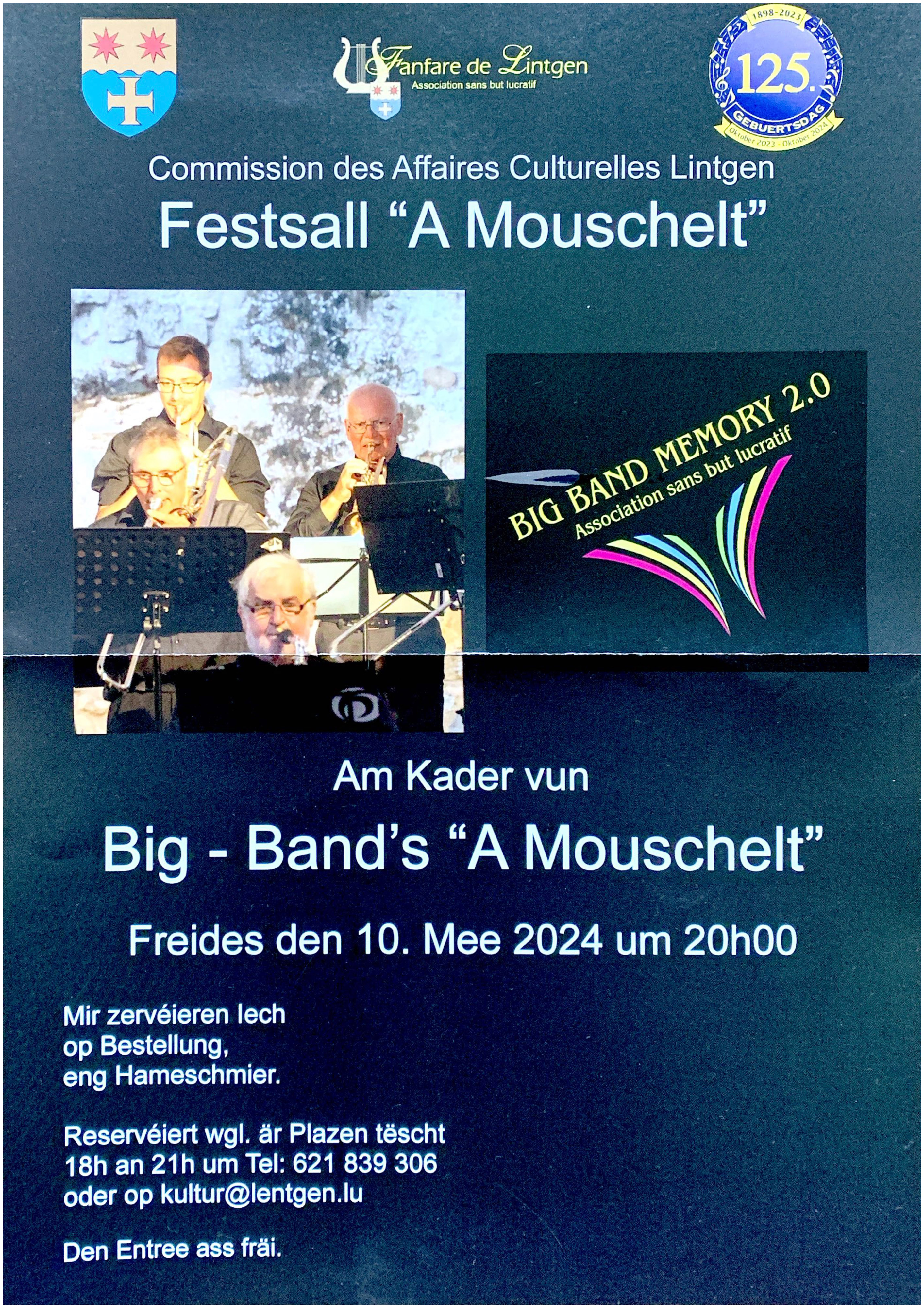 schléisse mir mat eisem Gala-Concert am Festsall “A Mouschelt” d’Feierlechkeeten fir 125 Joer Lëntgener Musek of.