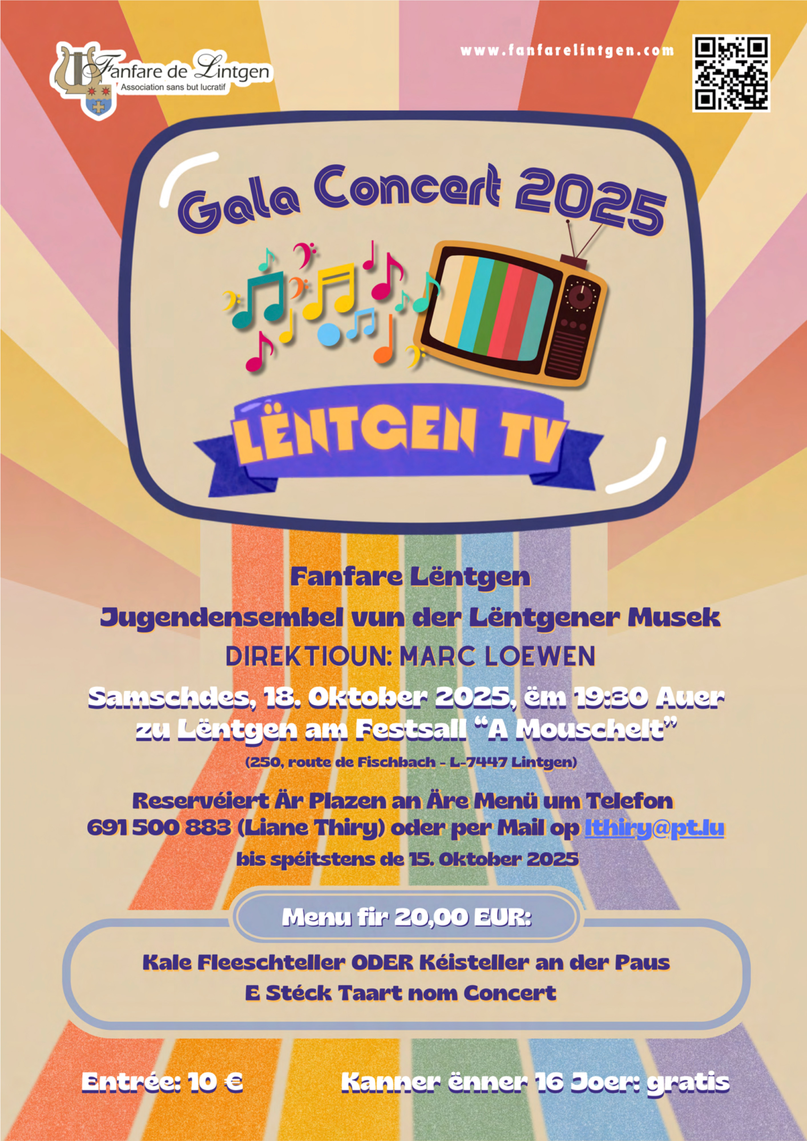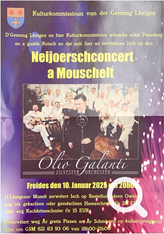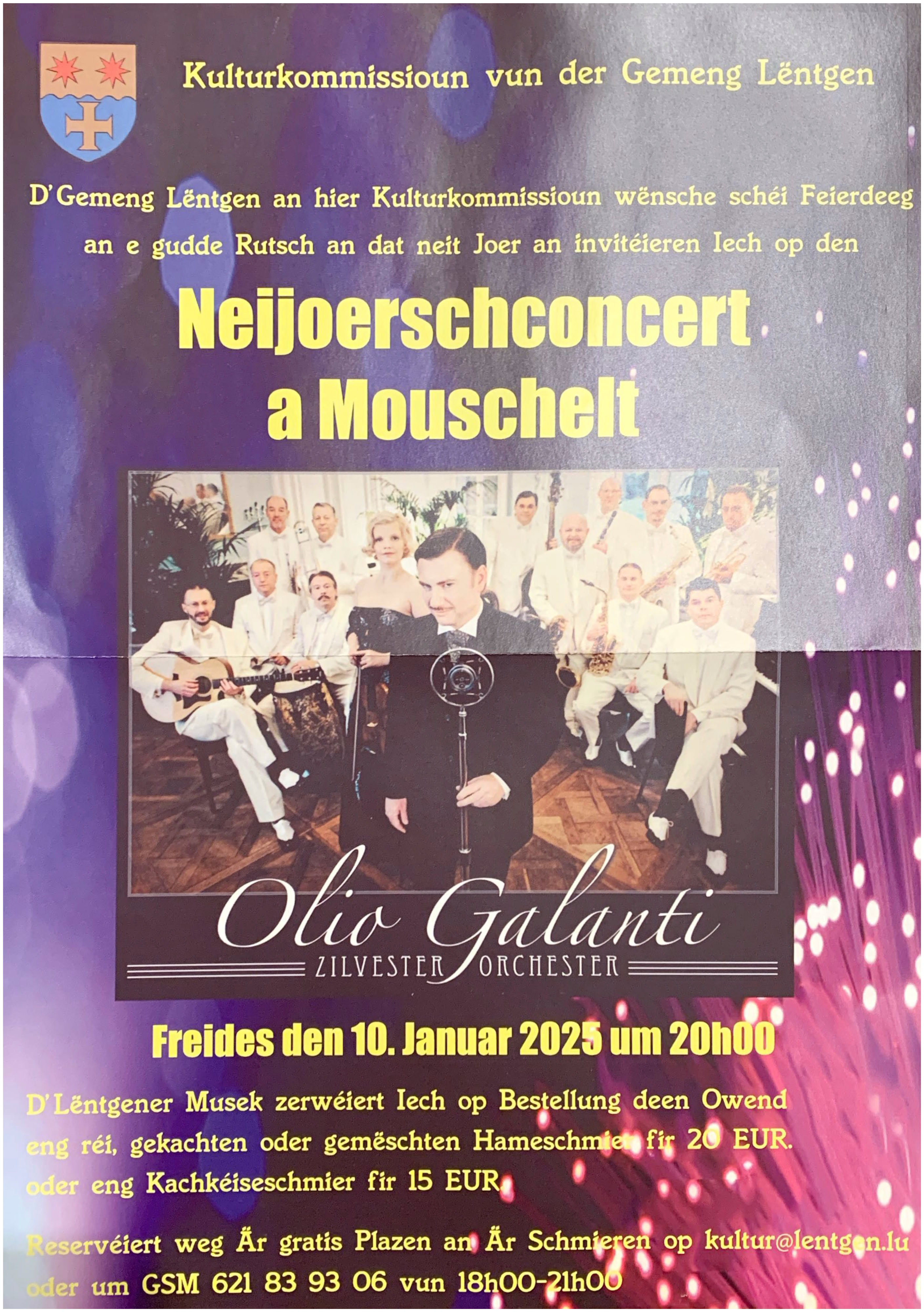 schléisse mir mat eisem Gala-Concert am Festsall “A Mouschelt” d’Feierlechkeeten fir 125 Joer Lëntgener Musek of.