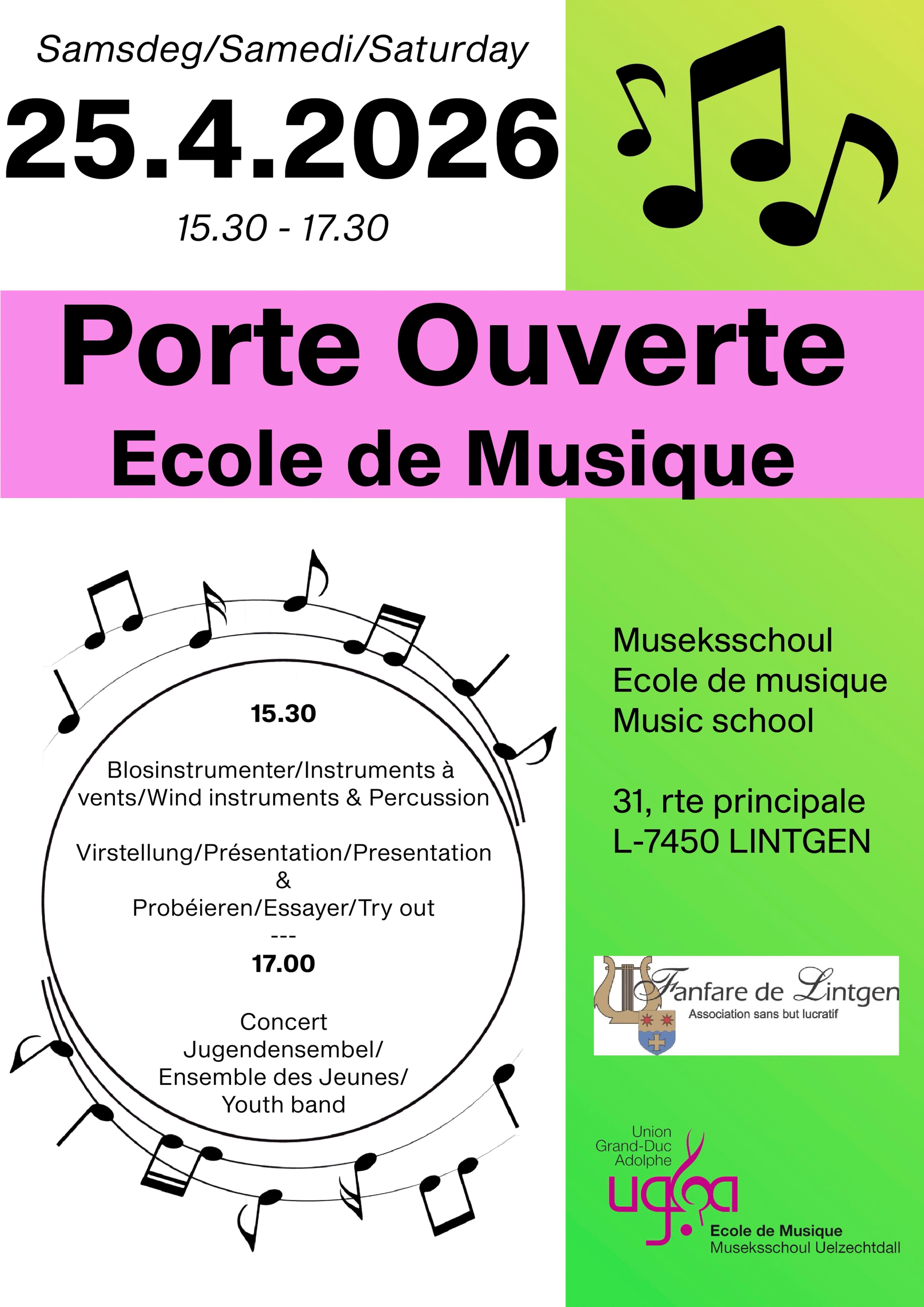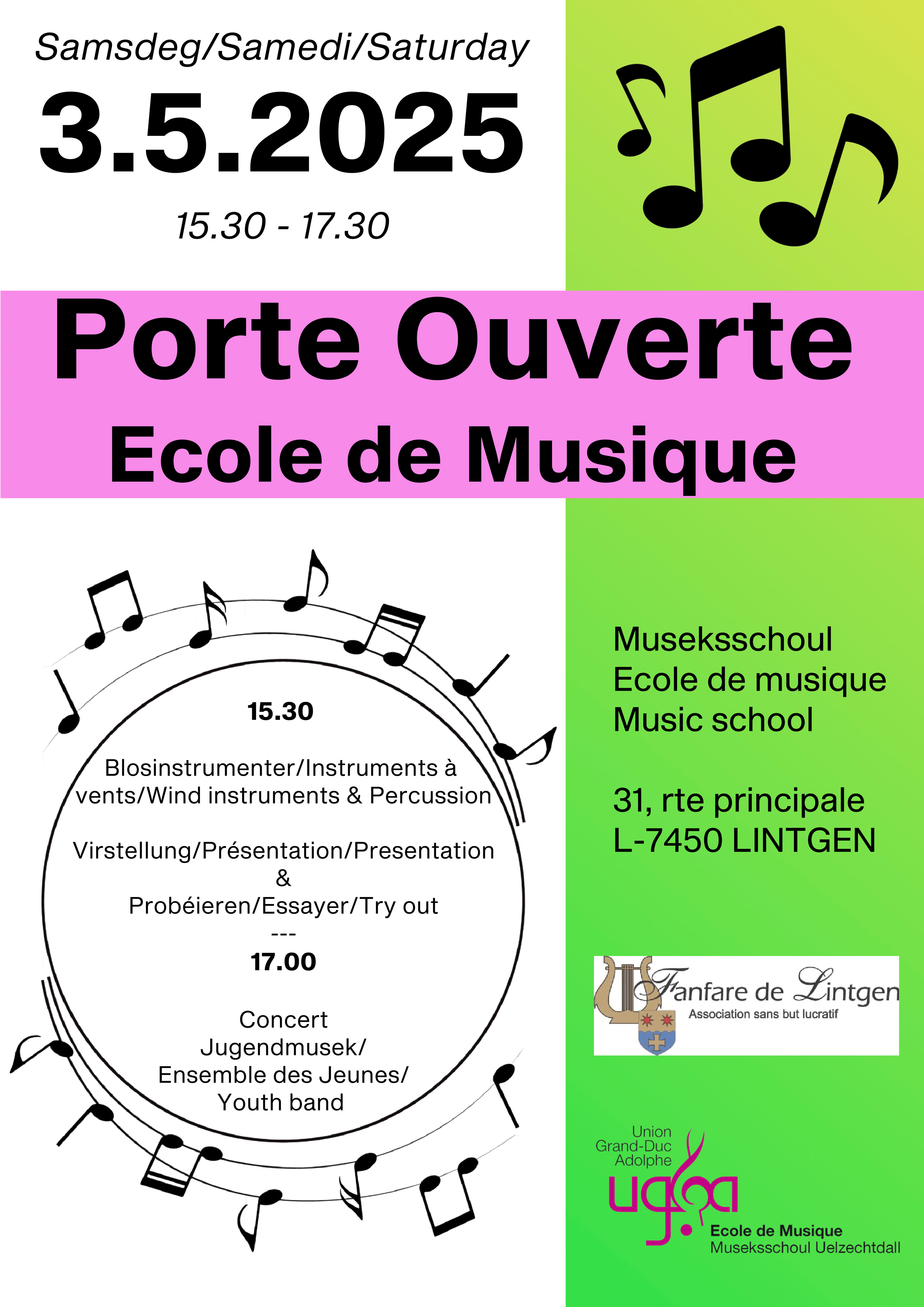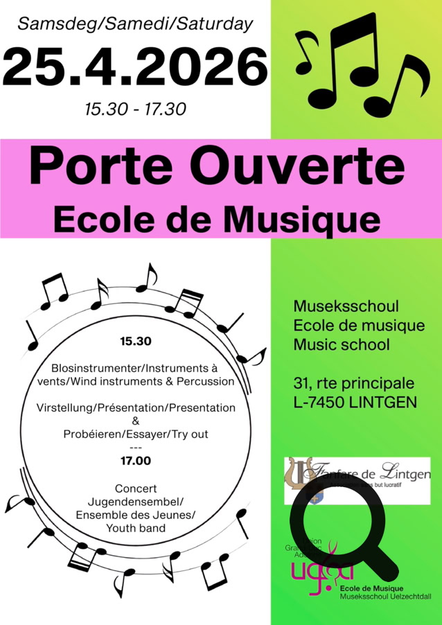 Ab 15.30 Auer kennt dir d’Museksgebäi besichtegen an déi verschidden Instrumenter aus dem Harmonie-Orchester probéieren.