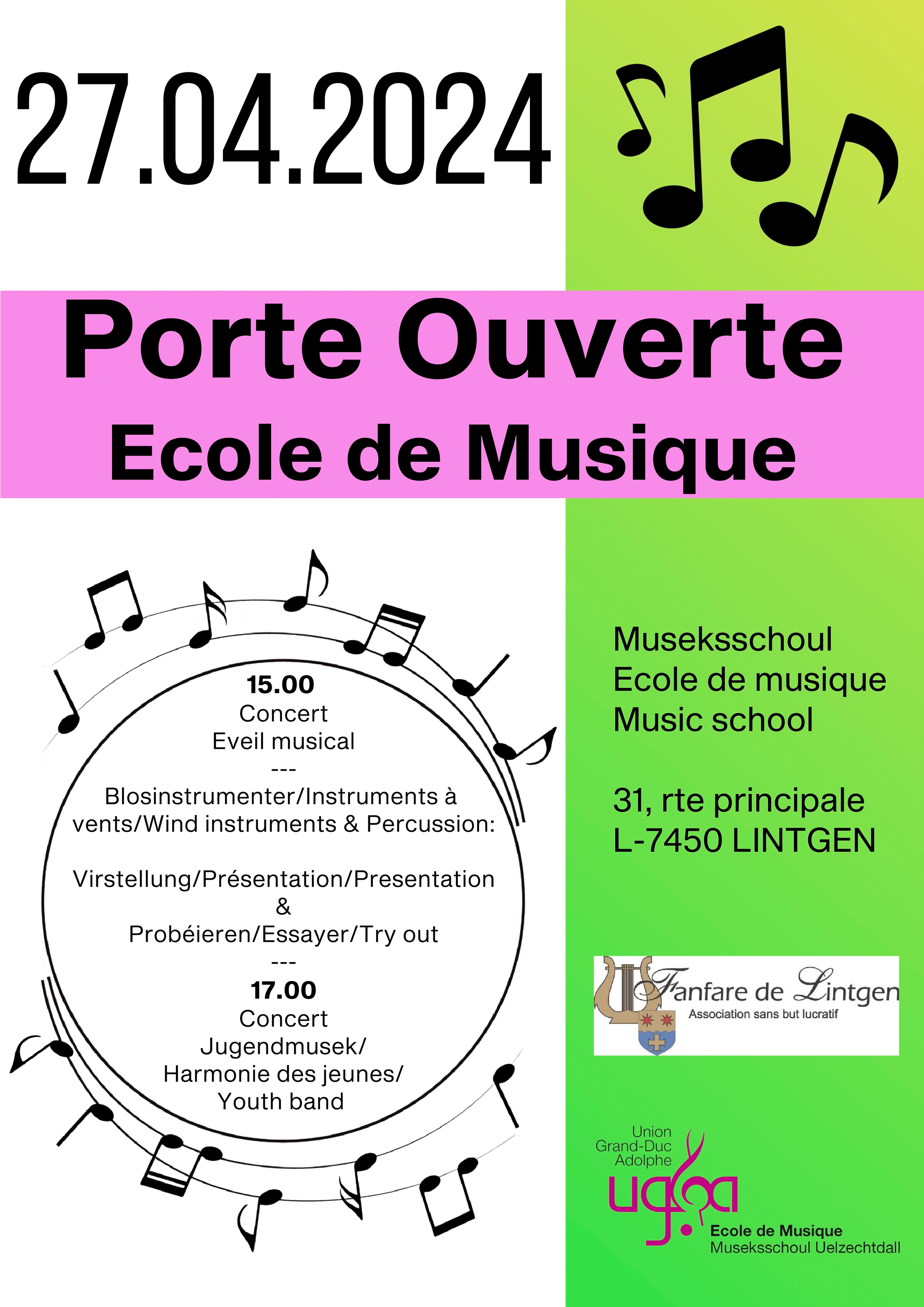 Den Eveil Musical presentéiert iech e klengen Concert. An als Ofschloss dpillt den Jugendensembel e klenge Concert bei deem dir iech kënnt zwëschent Musikanten setzen an esou e Concert aus der Siicht vum Museker kennt erliewen.
