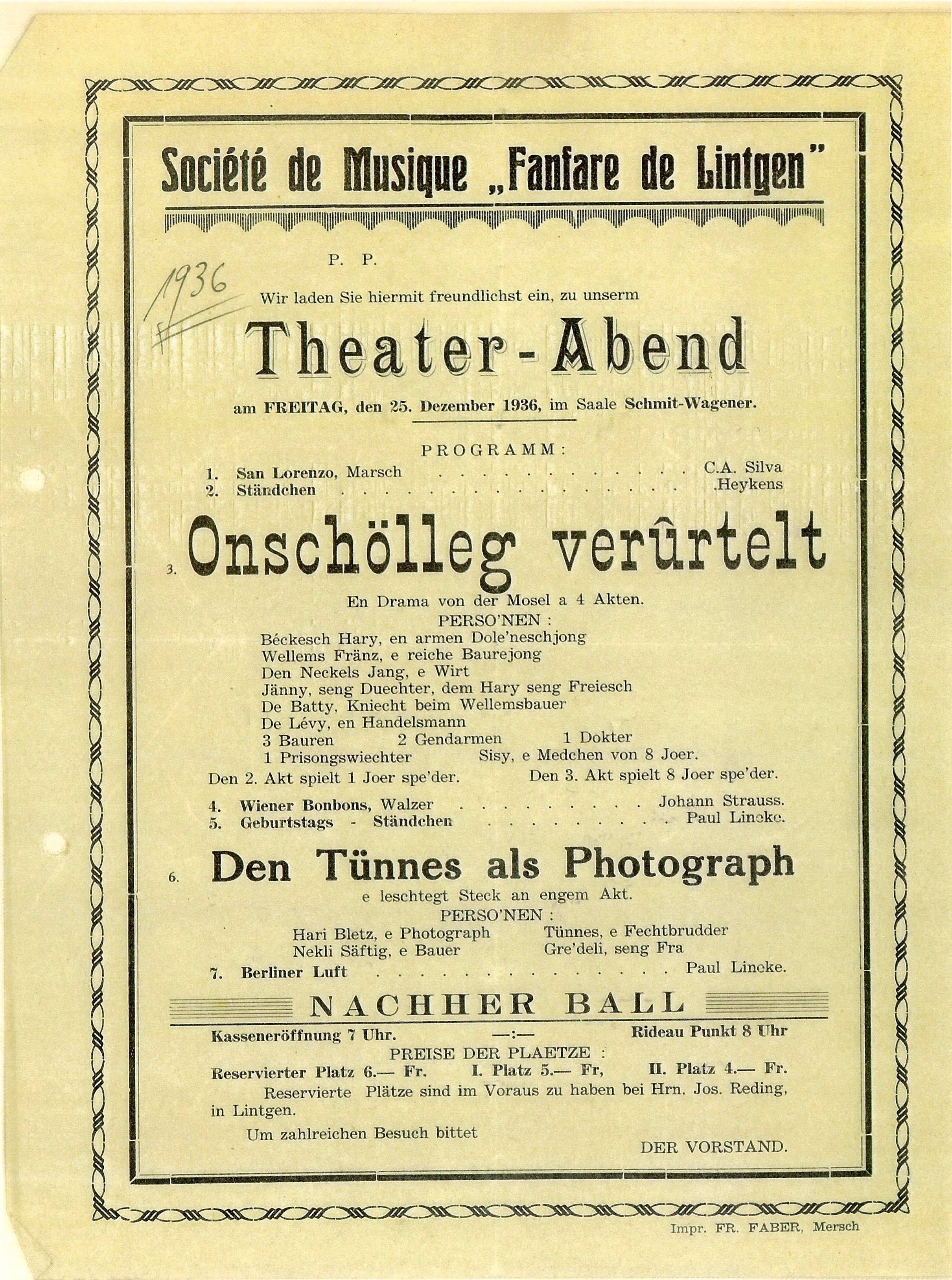 Steieren an Taxe bleiwen net aus. Fir d'Opféierung vun engem Theaterstéck musse 5 Frang un d'Gesellschaft "Droit d'Auteur" bezuelt ginn.