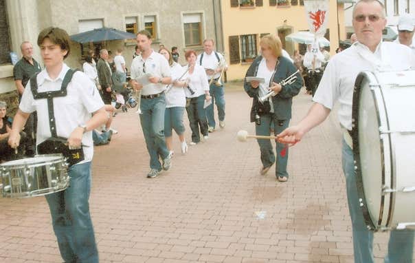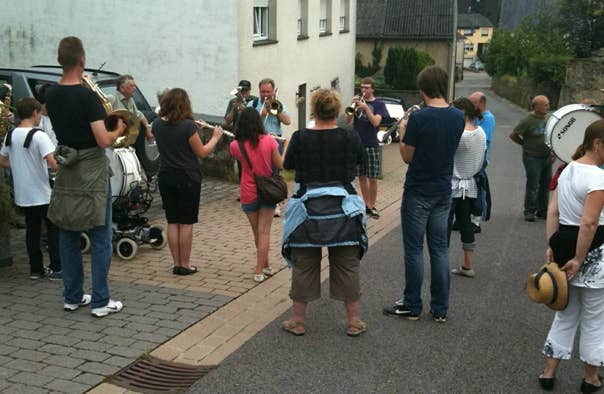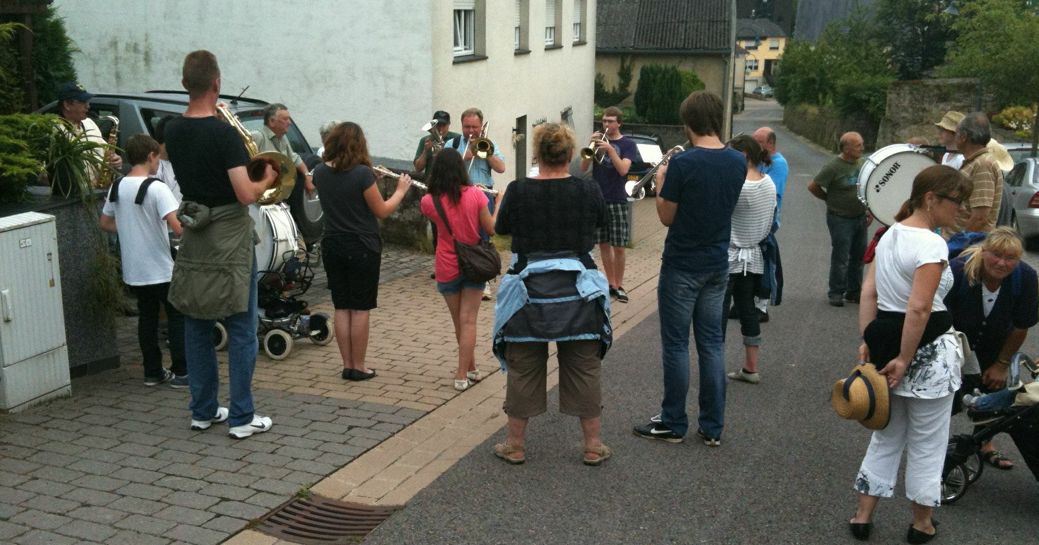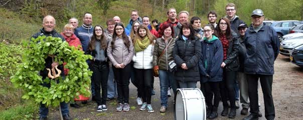 Wann den 1. Mee gefeiert gëtt, ass et selbstverständlech, dass d'Muikanten den Ëmzuch mat e puer schmasseg Märsch begleeden, nodeems den traditionelle Meekranz am Bësch gebonne ginn ass.