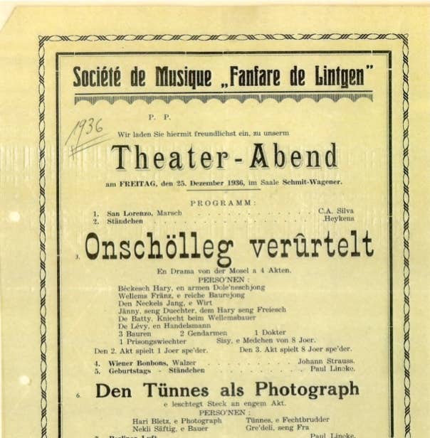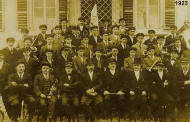 Et ass eng ganz schwéier Zäit fir d'Fanfare Lëntgen, 1936, bal den Aus. Marcel Martin, Jean-Pierre Probst, Jos. Reding, Emile Loewen a Nic. Stirn, fir nëmmen déi ze nennen, ginn net op.