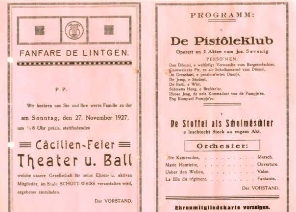 Den 10. Juni 1923 ass Stëftungsfest vun der Lëntgener Musek! Zënter 25 Joer stinn d'Memberen am Déngscht vun hirer Kultur, an dat gëtt gefeiert. Um Virowend ass Concert mat Fakelzuch, den Dag selwer Jubiläumsmass an Ëmzuch. Duerno ass musikalesch Ennerhalung op verschiddene Plazen am Duerf. Et gëtt Eierewäin fir d'Presidenten, Fräibéier fir d'Memberen an Erënnerungsmedaillë fir d'Veräiner. Den Dag schléisst of mat bengalescher Beliichtung a Volleksbal. Fir de Präis vun engem Frang ass dann och déi interessant Broschür ze kafen. De Enregistrement Miersch kritt 109 Frang Emsatzsteier.